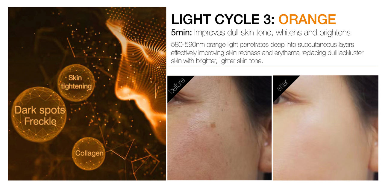 The LED Face Mask with silicone frame, contains a total of 807 LED (light emitting diodes). There are 269 red, 269 orange, and 269 blue therapeutic LED lights inside the silicone frame. Unlike UV light, the light that is from the sun, LED light is safe for consumption and is not harmful to the skin. The patented protective eye cover is a unique design, so that it blocks out the LED light so you can rest assure that your eyes are protected. The only LED face mask with this unique feature. The Neck Cover is a patented design that uses magnets to secure to the face mask. Simply line up the neck cover with the bottom of the face mask for complete face and neck mask coverage. To power on and off the mask, simply press the touch pad on the upper right side of the mask to activate the LED lights cycle. Touch once to power on. Touch again to begin the 25-minute light cycle. Relax and enjoy!